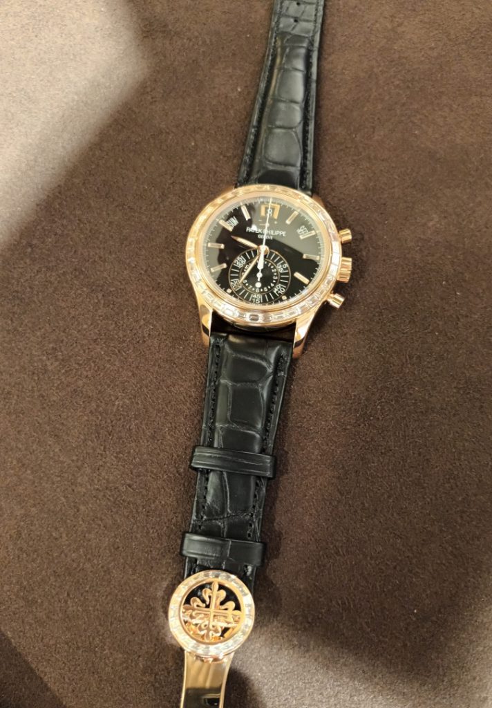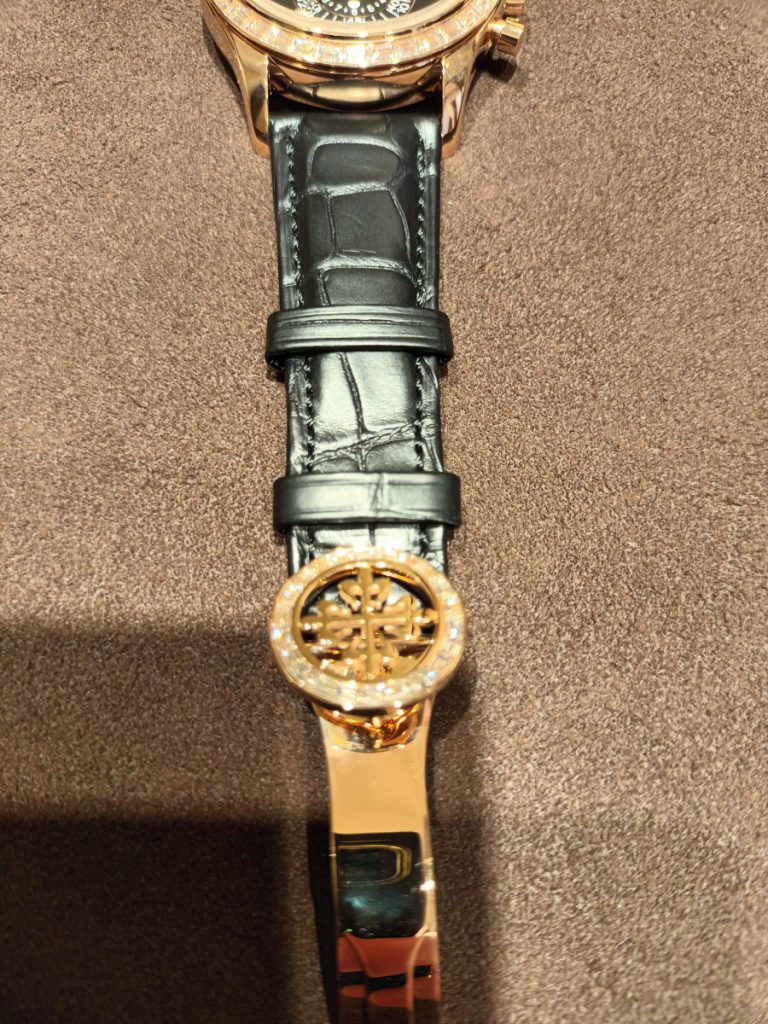 Straps can be attractive but normally are fairly utilitarian, however, not so in this case! Here we have a gold fold-over clasp, with 22 baguette diamonds (1.02 carats) set into the Calatrava Cross button. The strap itself is in semi-patent black alligator.