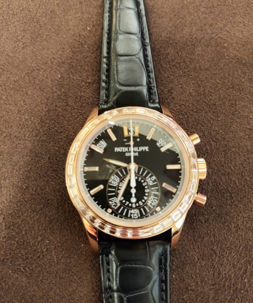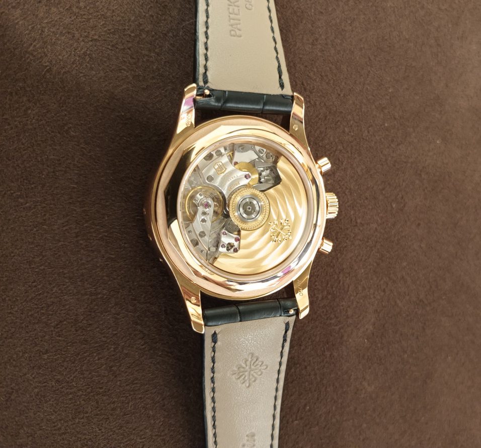 The item before us is reference 5961 R, and boasts a 40.5mm x 13.5mm polished 18ct rose gold case with nicely integrated lugs. All this is surrounded by a bezel set with 36 baguette diamonds – totaling 3.66 carats if you please! To the right is a chunky, conventionally-shaped and signed crown, flanked by the pump style chronograph pushers. On the left of the case are three recessed corrector pushers (adjusted by the supplied stylus) for the day/date/month. The glazing is via sapphire crystal – as is indeed the pane on the reverse. The watch has waterproofing to 30 meters.